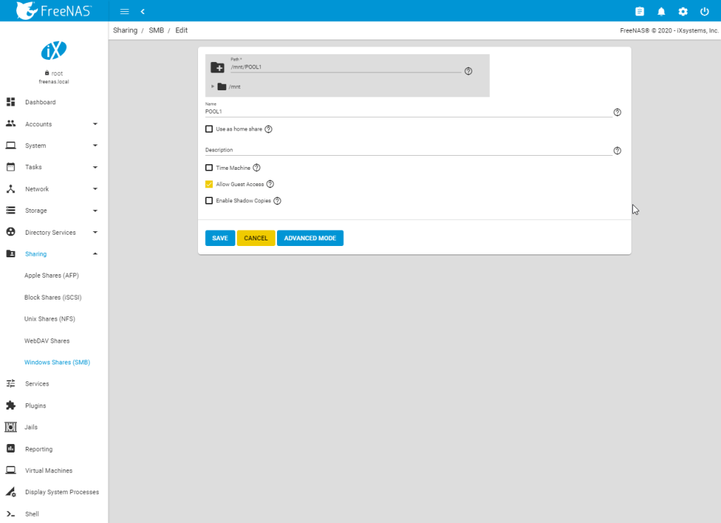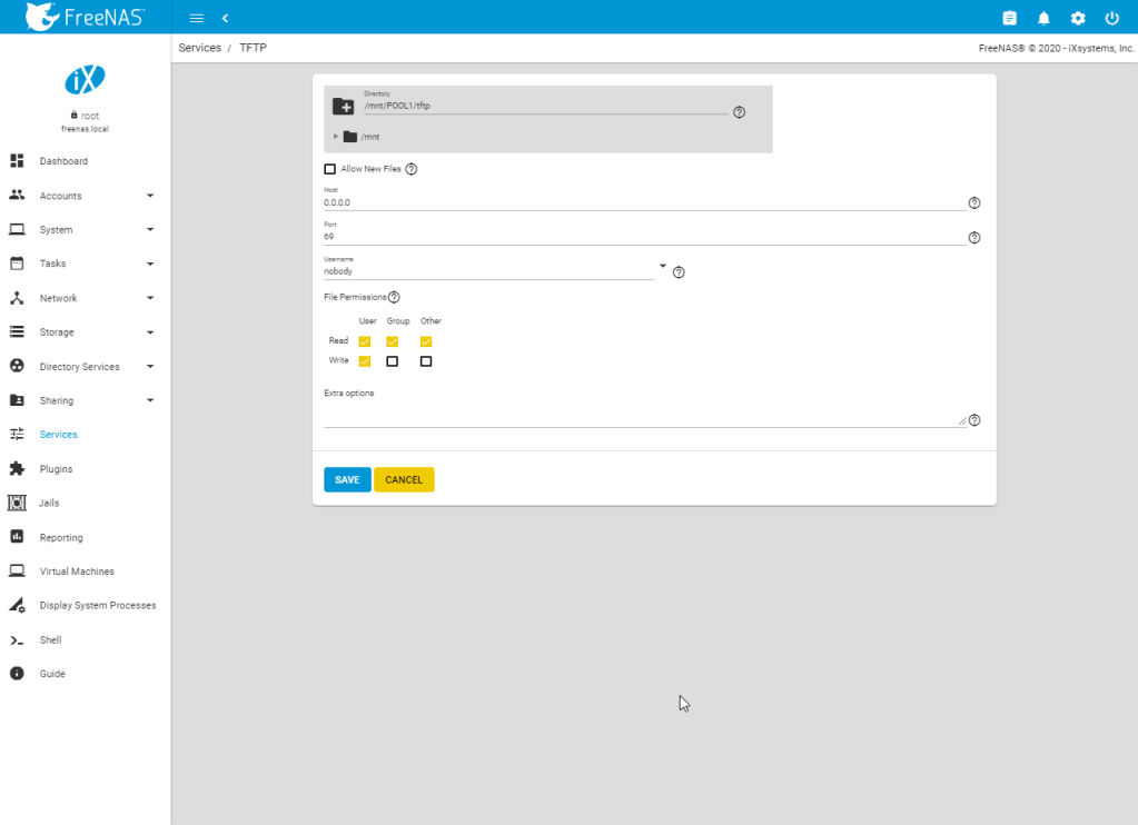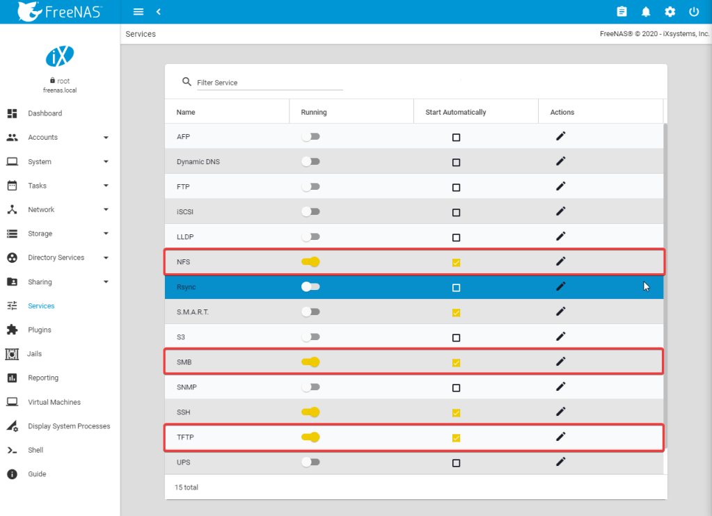 Next we will enable the NFS, SMB, and TFTP server on the freenas and configure their parameters: